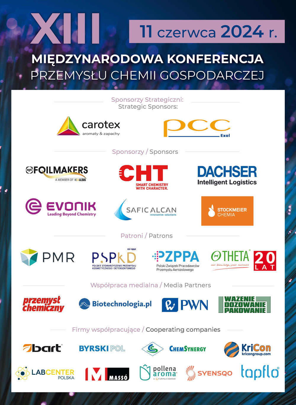 Patronat nad trzynastą edycją objęło Polskie Stowarzyszenie Przemysłu Kosmetycznego i Detergentowego, PMR Consulting & Research sp. z o.o., Polski Związek Pracodawców Przemysłu Aerozolowego, firma Theta Consulting sp. z o.o. Współpraca medialna konferencji: Biotechnologia.pl, Przemysł Chemiczny, Ważenie Dozowanie Pakowanie oraz Wydawnictwo Naukowe PWN SA.