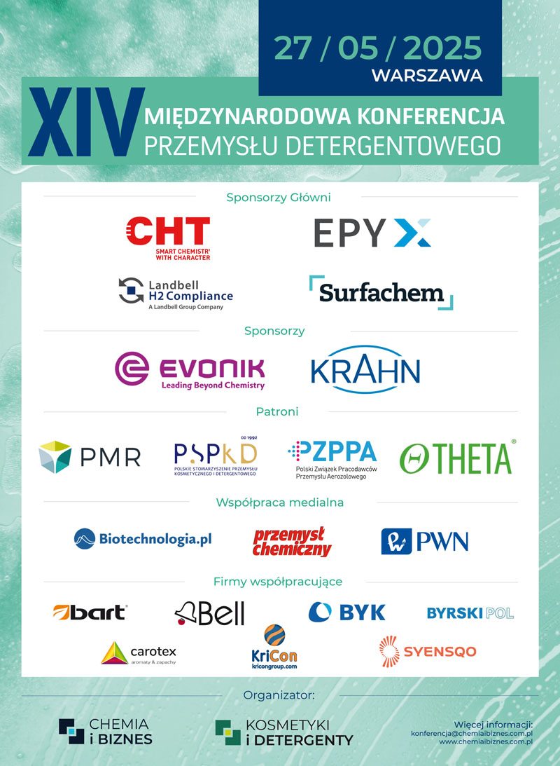 27 maja br. odbędzie się czternasta edycja Międzynarodowej Konferencji Przemysłu Detergentowego (Airport Hotel Okęcie****, ul. Komitetu Obrony Robotników 24, Warszawa).
