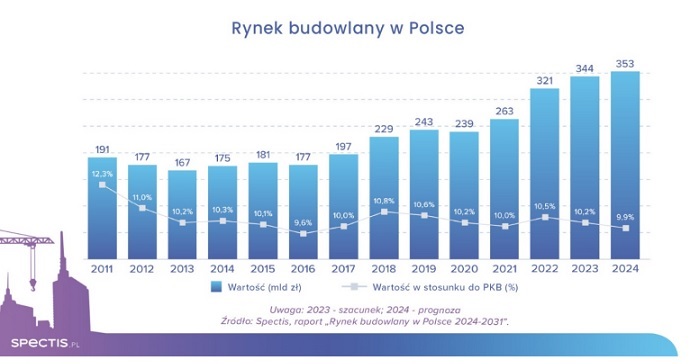 Jak wynika z raportu firmy badawczej Spectis, zatytułowanego „Rynek budowlany w Polsce 2024-2031”, pomiędzy 2016 r. a 2024 r. wartość rynku budowlanego wzrosła ze 177 mld zł do ponad 350 mld zł. Obserwowane w tym okresie wzrosty miały jednak głównie charakter nominalny i wynikały z rosnących cen materiałów i siły roboczej. W ujęciu realnym, mierzonym zużyciem podstawowych materiałów budowlanych (np. cementu, betonu czy stali), rynek budowlany pozostaje w fazie długoterminowej stabilizacji, na co wskazuje również porównanie wartości rynku budowlanego do wartości polskiego Produktu Krajowego Brutto. Po osiągnięciu rekordowego udziału sięgającego ponad 12% w 2011 r. (okres intensywnych przygotowań do organizacji Euro 2012), od 2013 r. wartość rynku budowlanego w stosunku do PKB oscyluje wokół 10%.