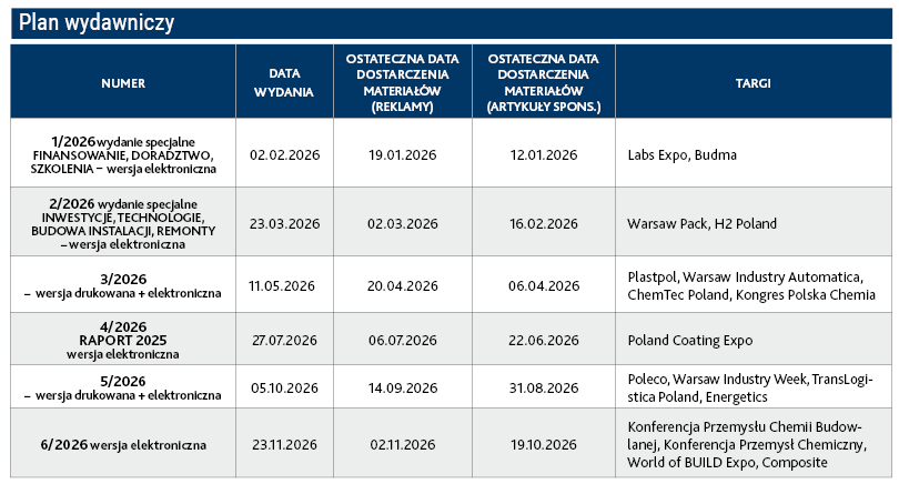 "Chemia i Biznes" to dwumiesięcznik biznesowo-informacyjny, stworzony z myślą o firmach poszukujących rzetelnej, aktualnej i profesjonalnie przygotowanej informacji na temat rynku chemicznego, laboratoryjnego, tworzywowego, kompozytowego, opakowaniowego, budownictwa, rynku energii, jak i sektorów powiązanych: transportowego, nawozowego, finansowego, z zakresu remontów i instalacji, jak również automatyki, robotyki i rozwiązań IT.